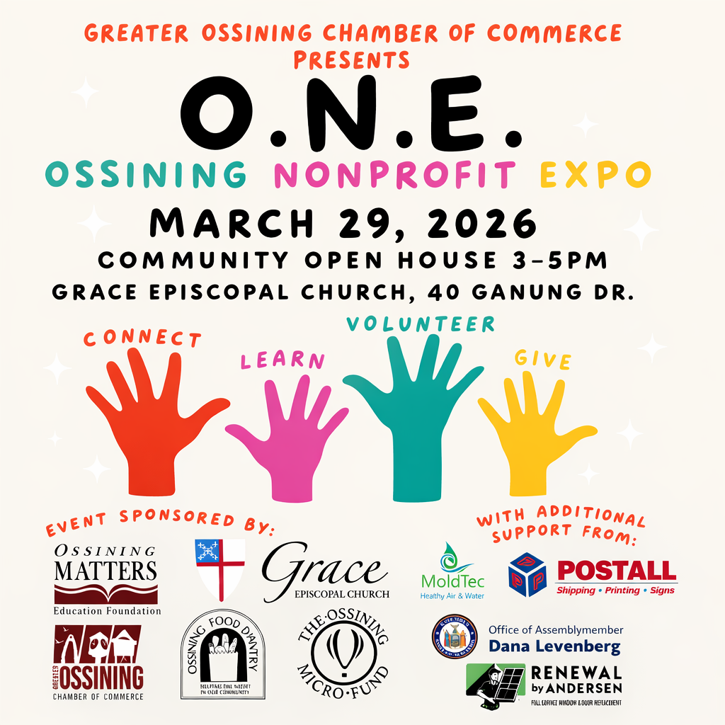 The Ossining Arts Council is excited to participate in the upcoming O.N.E. Ossining Nonprofit Expo, a community event organized by the Greater Ossining Chamber of Commerce that brings together local nonprofit organizations working to enrich life in Ossining and the surrounding area.