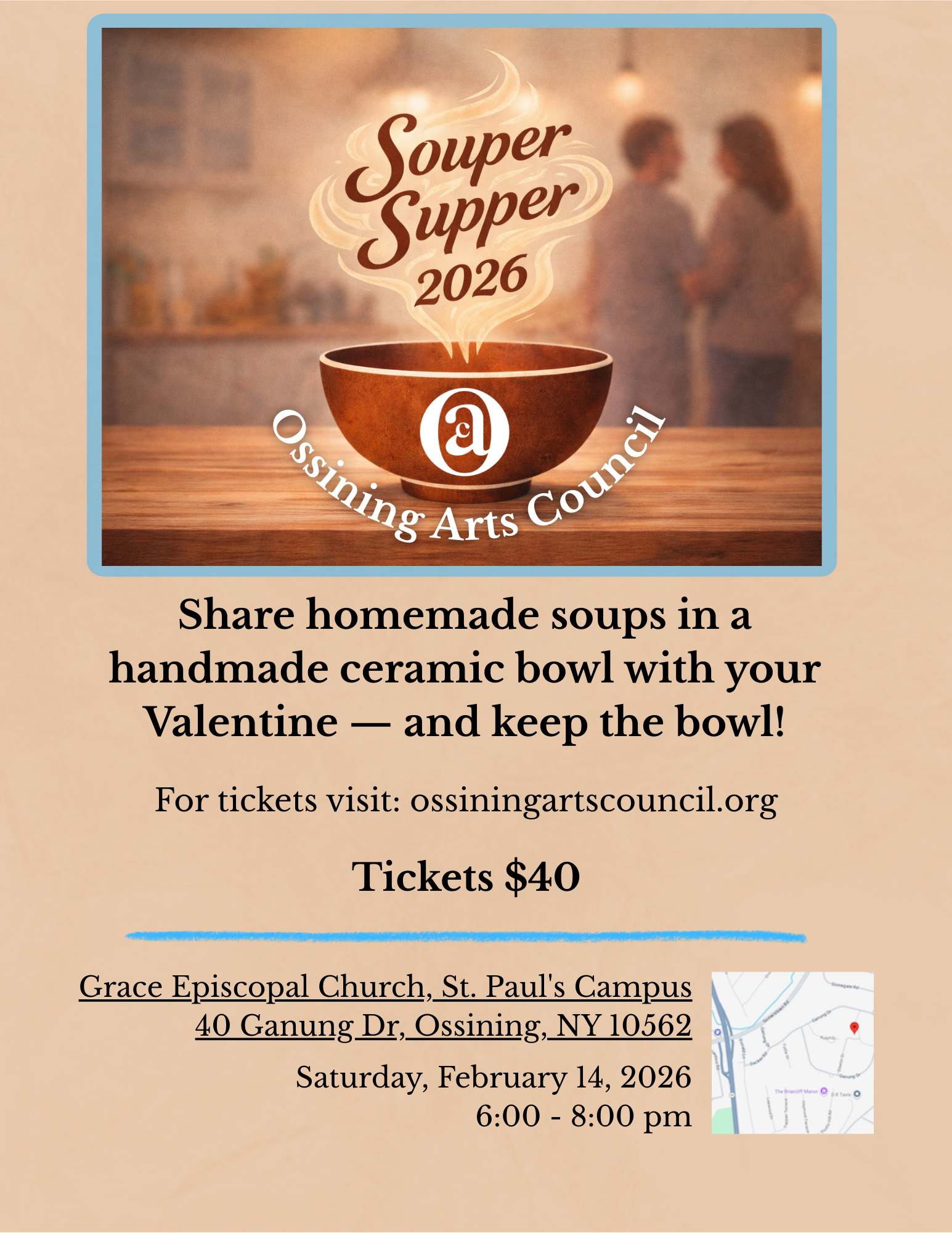 Join us on Saturday, February 14, 2026, from 6:00–8:00 pm at Grace Episcopal Church-St. Paul's campus, (40 Ganung Dr., Ossining). Guests will enjoy a selection of homemade soups, live music, and the opportunity to share the evening with a loved one, a friend, or fellow supporters of the arts. Each ticket includes a handmade ceramic bowl to enjoy during the event and take home afterward.