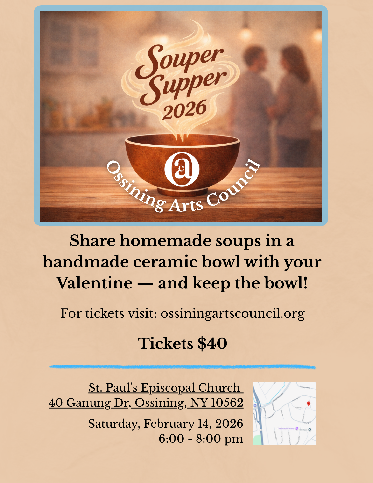 Join us on Saturday, February 14, 2026, from 6:00–8:00 pm at St. Paul’s Episcopal Church, (40 Ganung Dr., Ossining). Guests will enjoy a selection of homemade soups, live music, and the opportunity to share the evening with a loved one, a friend, or fellow supporters of the arts. Each ticket includes a handmade ceramic bowl to enjoy during the event and take home afterward.