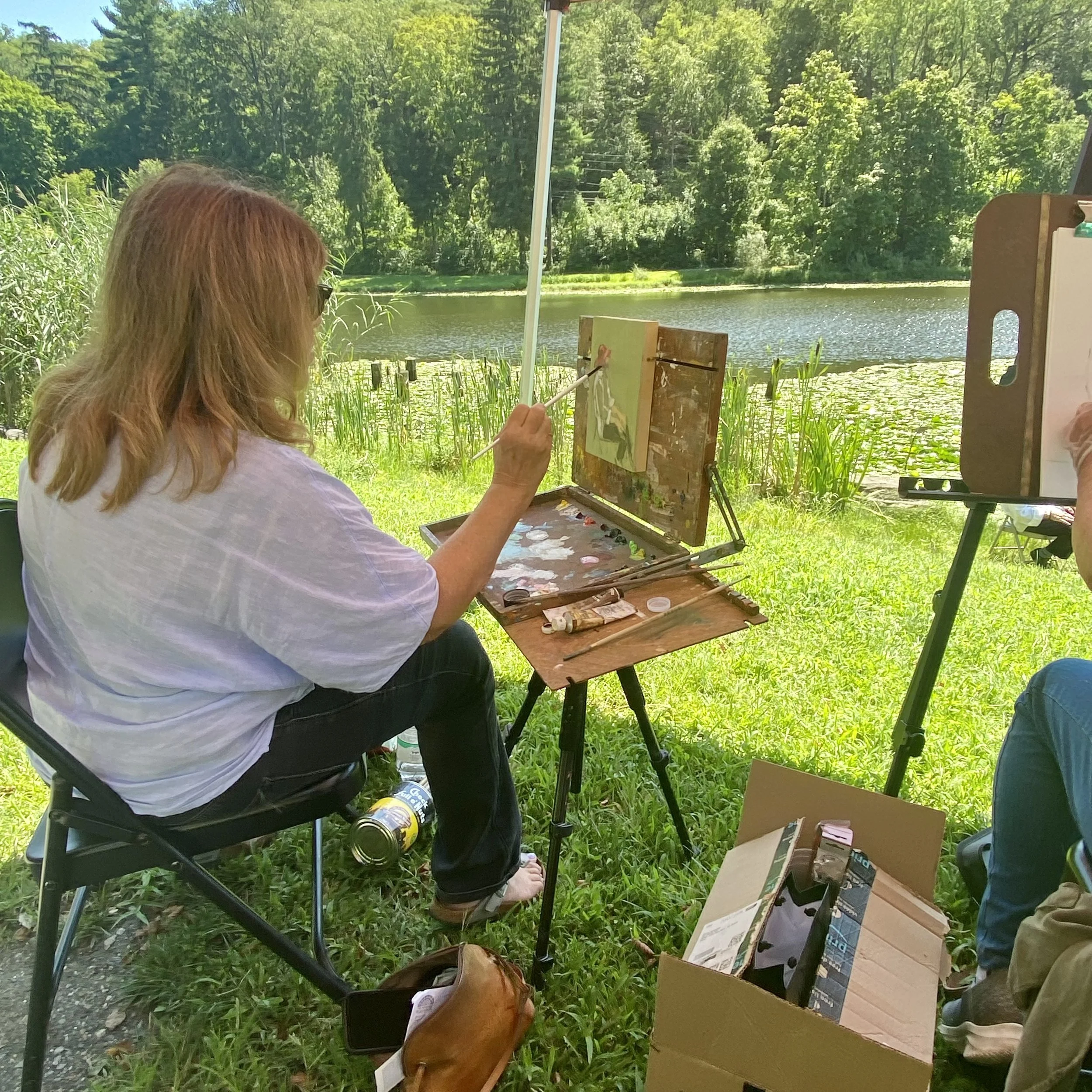 Paint a picture! Artists, painting and drawing, taking a break to chat, eat sandwiches, and have a cool drink on a hot summer day. The sun sparkling on Cedar Lane Pond and water lilies in full bloom after a rainy week that threatened to cancel the event. A rustic peasant in a red hat and a fine lady, complete with parasol, sitting nearby, both lost in reverie.
